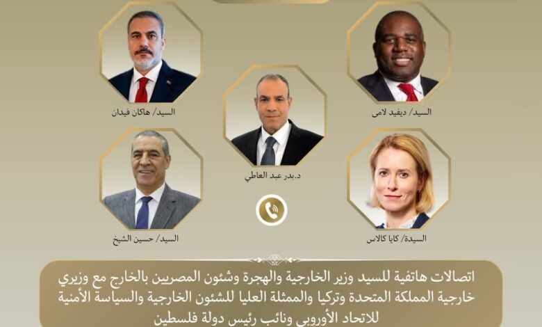 في إطار الاتصالات المكثفة مع الأطراف الدولية لدعم جهود وقف إطلاق النار في قطاع غزة، جرت اتصالات هاتفية بين د. بدر عبد العاطي وزير الخارجية والهجرة وشئون المصريين في الخارج مع كل من السيد “ديفيد لامى” وزير خارجية المملكة المتحدة، والسيد “هاكان فيدان” وزير خارجية تركيا، والسيدة “كايا كالاس” الممثلة العليا للشئون الخارجية والسياسة الأمنية للاتحاد الأوروبى، والسيد “حسين الشيخ” نائب رئيس اللجنة التنفيذية لمنظمة التحرير الفلسطينية ونائب رئيس دولة فلسطين، وذلك يوم الثلاثاء ١٩ أغسطس ٢٠٢٥.