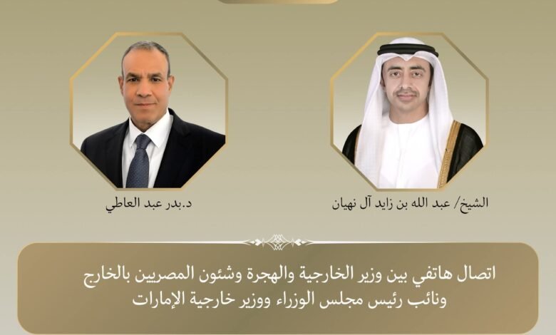 جرى اتصال هاتفي بين د. بدر عبد العاطي وزير الخارجية والهجرة وشئون المصريين بالخارج، وسمو الشيخ عبد الله بن زايد آل نهيان نائب رئيس مجلس الوزراء وزير الخارجية بدولة الإمارات العربية المتحدة الشقيقة يوم الاثنين ٥ يناير وذلك في إطار التشاور والتنسيق المستمر بين البلدين الشقيقين إزاء سبل دعم العلاقات الثنائية، وبحث عدد من القضايا الإقليمية ذات الاهتمام المشترك.