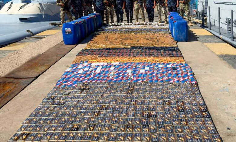 وفى سياق متصل نجحت عدد من الوحدات البحرية فى التصدى لمحاولة تهريب كميات من المواد المخدرة بنطاق الأسطول الجنوبى ، من خلال إكتشاف وضبط عدد ( 1 ) فلوكة على متنها ( 7792 ) فرشاً من مخدر الحشيش و( 17 ) لفافة من مخدر الهيدرو ، وبلغت قيمة كافة المضبوطات ما يقرب من مليار و( 164 ) مليون جنيه بدون الذراعات المخدرة ، وقد تم إحالة المضبوطات إلى جهات الإختصاص لإتخاذ الإجراءات القانونية حيالها .