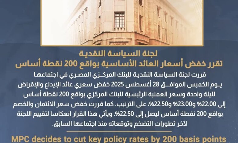 البنك المركزي المصري يعلن خفض سعر الفائدة 2% على الإيداع والاقتراض