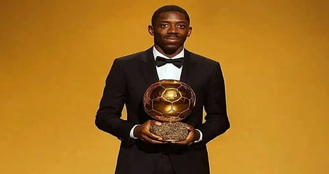 فاز الفرنسي عثمان ديمبيلي نجم فريق باريس سان جيرمان ومنتخب فرنسا بأفضل لاعب في العالم، خلال حفل جوائز الكرة الذهبية، الذي يقام بأحد المسارح العريقة في العاصمة الفرنسية باريس، اليوم الإثنين.