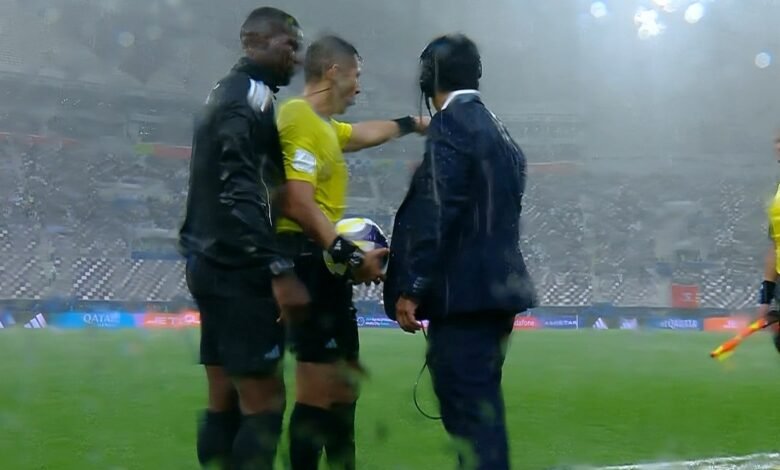 وقالت قنوات الكاس القطرية إن الحكم رفض إلغاء المباراة وقرر استكمالها خلال نصف ساعة من الآن.