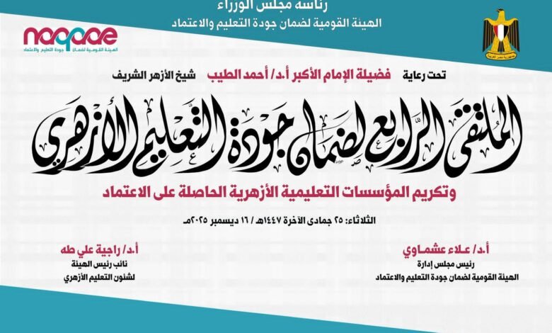 تعقد الهيئة القومية لضمان جودة التعليم والاعتماد برئاسة مجلس الوزراء في العاشرة من صباح الغد الثلاثاء ١٦ ديسمبر الملتقى الرابع لضمان جودة التعليم الأزهري، ويصاحبه احتفالية تكريم المؤسسات التعليمية الأزهرية الحاصلة على الاعتماد بقاعة الاحتفالات الكبرى بمركز الأزهر للمؤتمرات بمدينة نصر .