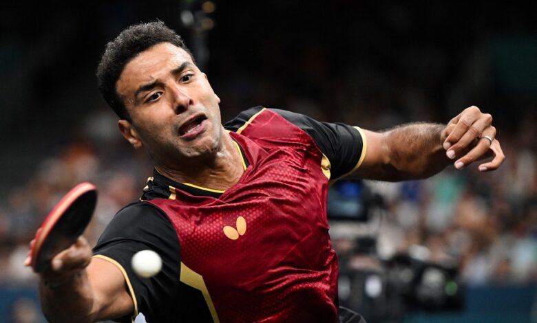 Egypt's Omar Assar plays a return to Kazakhstan's Kirill Gerassimenko during their men's table tennis singles round of 16 at the Paris 2024 Olympic Games at the South Paris Arena in Paris on July 31, 2024. (Photo by JUNG Yeon-je / AFP)