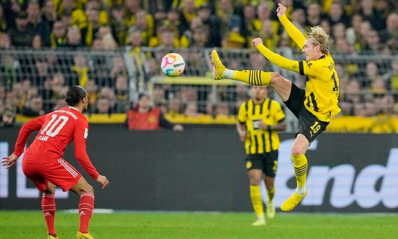 Dortmund's Julian Brandt reaches for the ball in front of Bayern's Leroy Sane, left, during the German Bundesliga soccer match between Borussia Dortmund and Bayern Munich in Dortmund, Germany, Saturday, Oct. 8, 2022. (AP Photo/Martin Meissner)