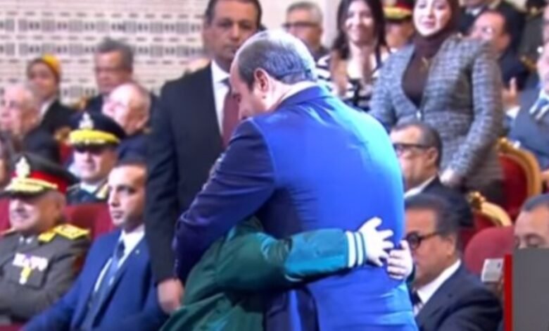 ليرد الرئيس السيسي على ابن الشهيد العقيد رامي هلال، “أنا اللي بحبك يا حبيبي وانا أسلم واتشرف بيك، ليقوم الرئيس السيسي باحتضانه.