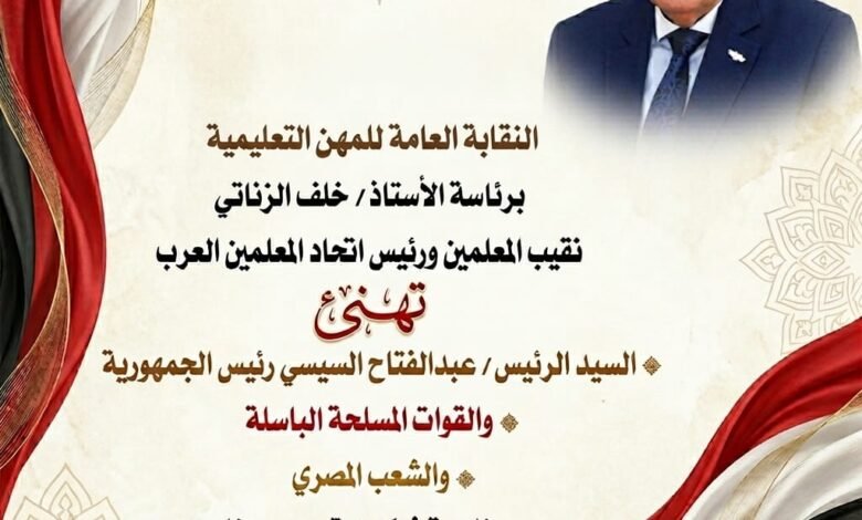 وجه خلف الزناتي نقيب المعلمين ورئيس اتحاد المعلمين العرب، التهنئة إلى الرئيس عبد الفتاح السيسي رئيس الجمهورية، والقوات المسلحة، والشعب المصري، بمناسبة الذكرى الـ ٤٤ لتحرير سيناء.