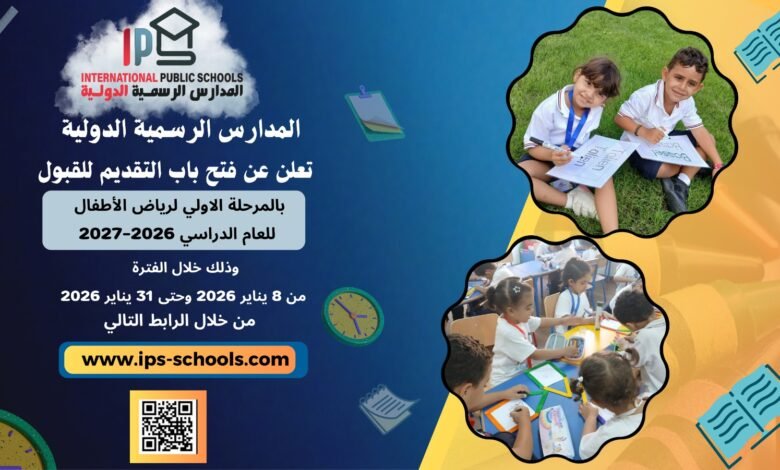 تعلن وزارة التربية والتعليم والتعليم الفني عن فتح باب التقديم للالتحاق بالمدارس الرسمية الدولية (International Public Schools – IPS) للمرحلة الأولى من رياض الأطفال (KG1)، للعام الدراسي 2026–2027.