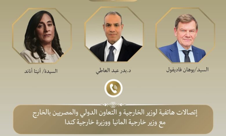 تلقى د. بدر عبد العاطي وزير الخارجية والتعاون الدولي والمصريين بالخارج، اتصالين هاتفيين يوم الاثنين ٦ أبريل من كل من السيد “يوهان فاديفول” وزير خارجية ألمانيا، والسيدة “أنيتا أناند” وزيرة خارجية كندا، لبحث مستجدات الوضع الإقليمي وجهود خفض التصعيد.