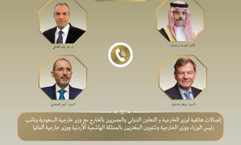 جرت سلسلة اتصالات هاتفية بين د. بدر عبد العاطي وزير الخارجية والتعاون الدولي والمصريين بالخارج، وكل من السيد يوهان فاديفول ووزير خارجية ألمانيا والسيد أيمن الصفدي نائب رئيس الوزراء ووزير الخارجية وشئون المغتربين بالمملكة الأردنية الهاشمية الشقيقة، وصاحب السمو الأمير فيصل بن فرحان وزير خارجية المملكة العربية السعودية الشقيقة، ومسئولين بالمفوضية الأوروبية يوم السبت ٢٨ مارس، حيث تناولت الاتصالات التطورات المتسارعة والتصعيد العسكري الذي تشهده المنطقة، والجهود المبذولة لخفض التصعيد الإقليمي.